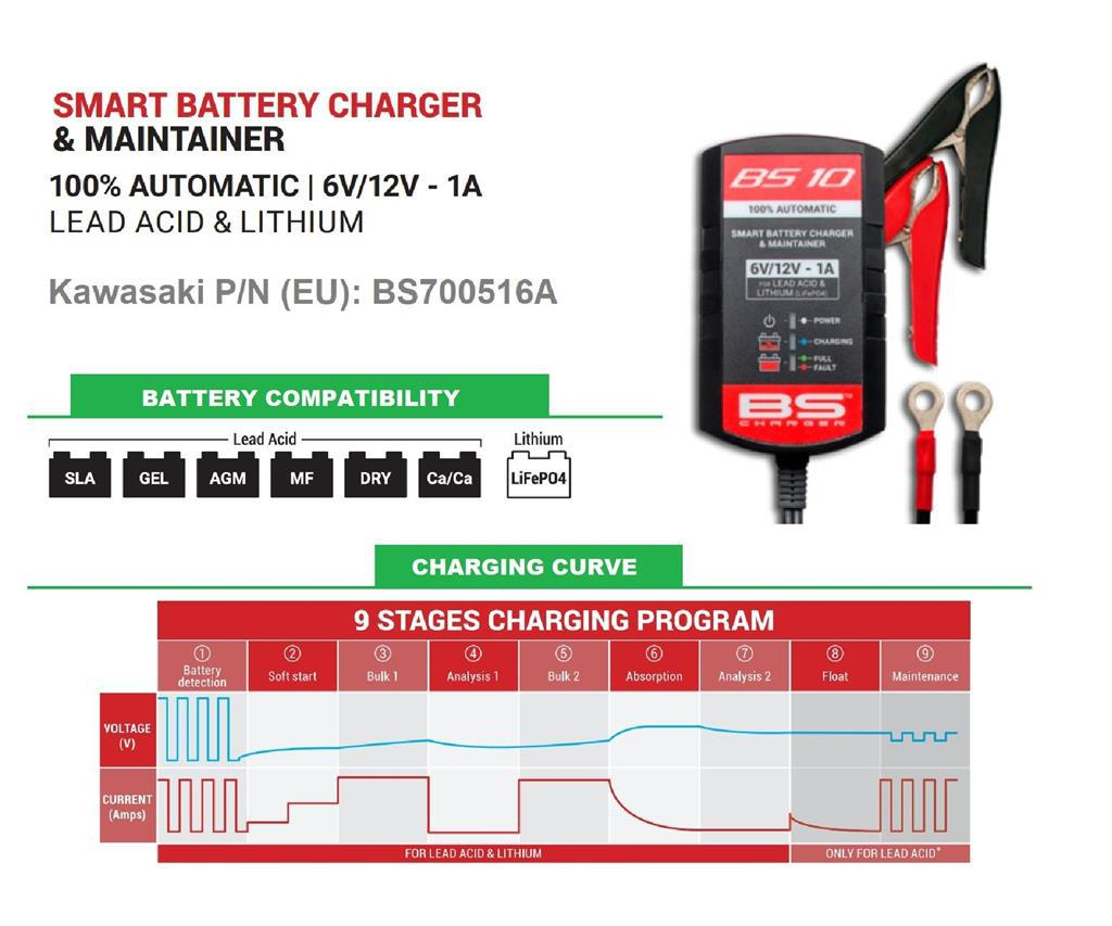 To keep your battery in good shape during the winter months and make a fresh start in the spring, Kawasaki offers a compact Smart battery charger. The Kawasaki Smart Battery Charger can charge and maintain traditional lead-acid, gel and new Lithium/LiFePo4 batteries.