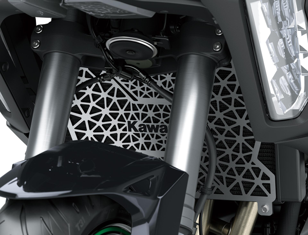 Help protect your radiator from road debris with rugged metal guards featuring an exclusive laser-cut Kawasaki logo. Laser-cut pattern offers increased airflow while adding minimal weight.
